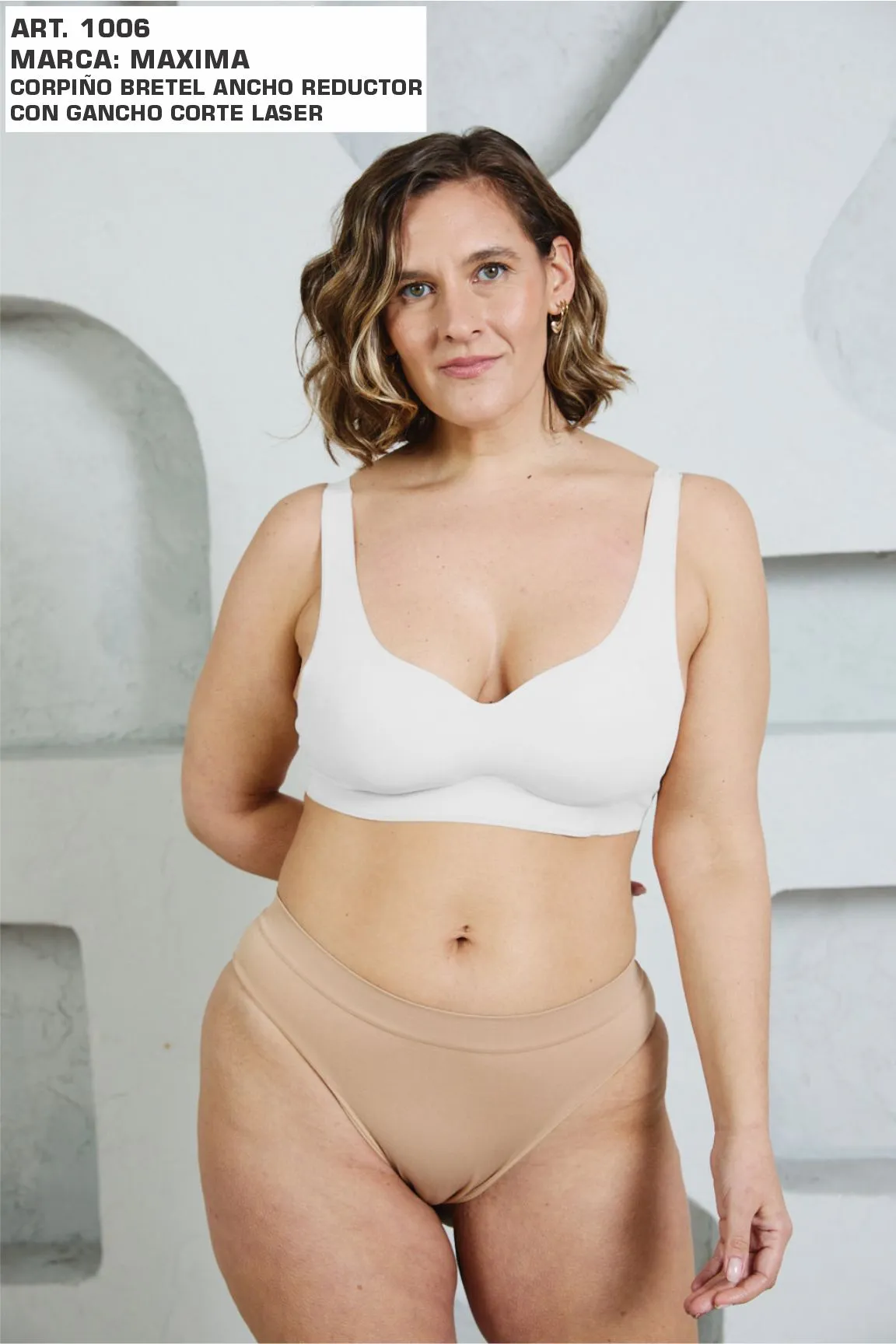 CORPIÑO BRETEL ANCHO REDUCTOR CON GANCHO CORTE LASER. TALLES: S/M(85-90) - L/XL(95/100) - XXL(105) - XXXL(110). COLORES: BLANCO - NEGRO - AVELLANA