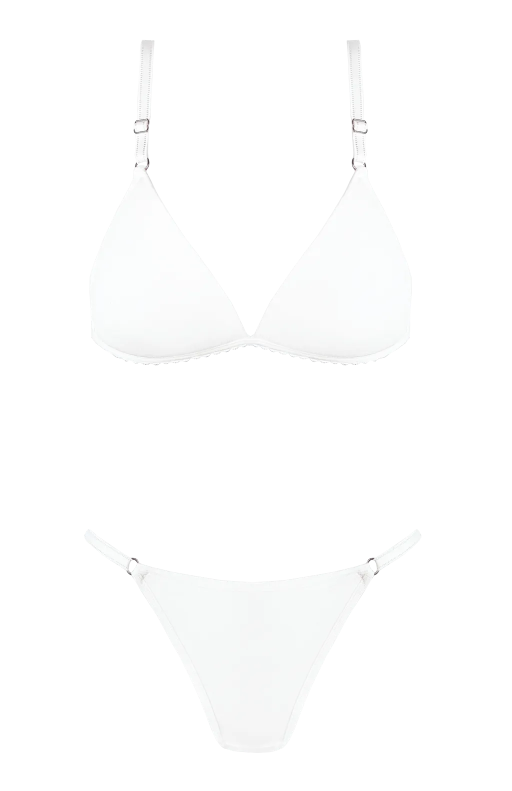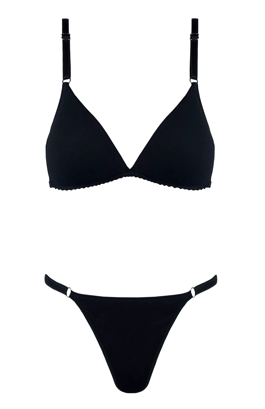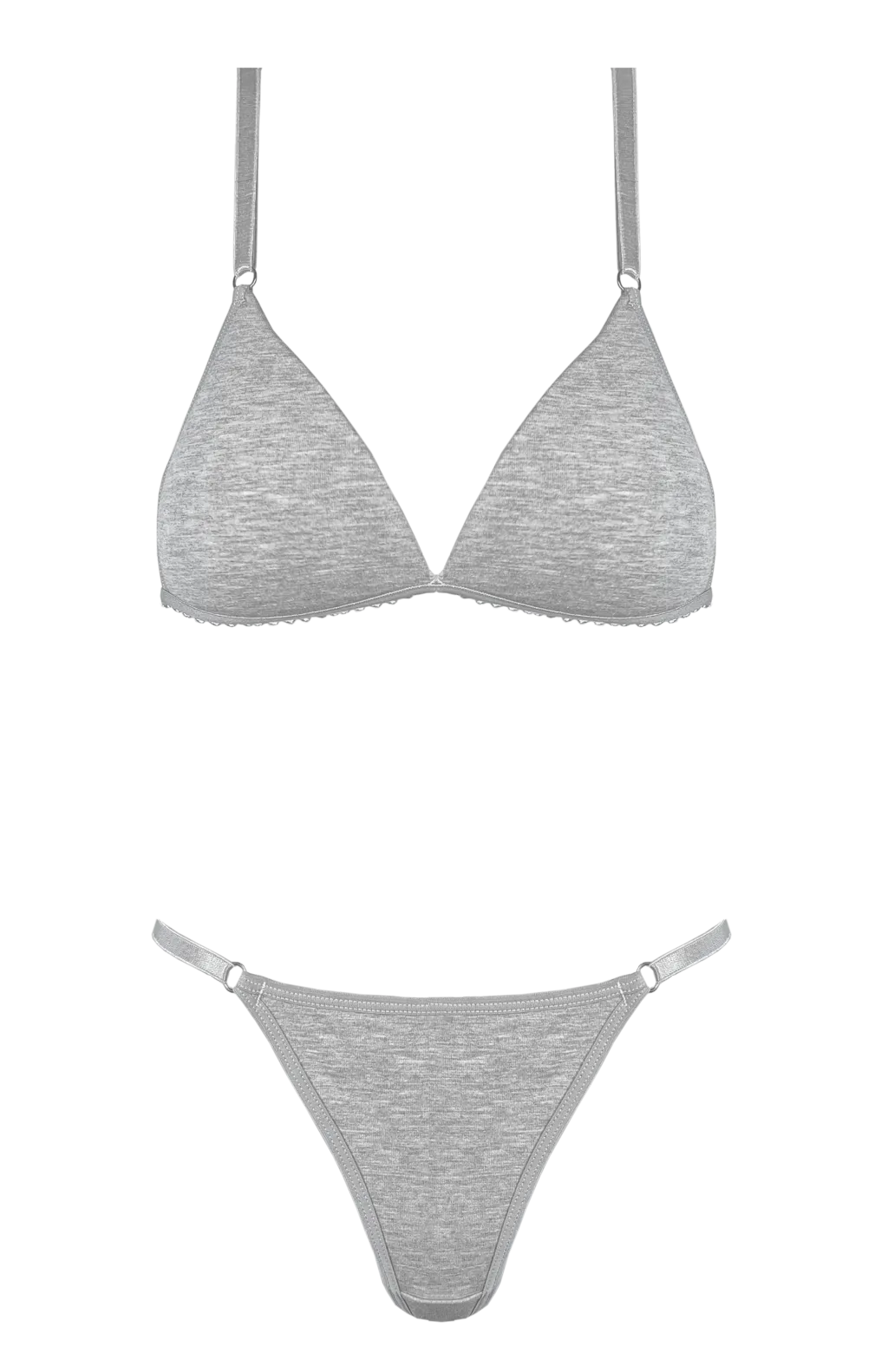 CONJUNTO ALGODON Y LYCRA TRIANGULO TAZA SOFT CON TANGALESS REGULABLE. TALLES: 85 AL 100. COLORES: BLANCO - NEGRO - GRIS.