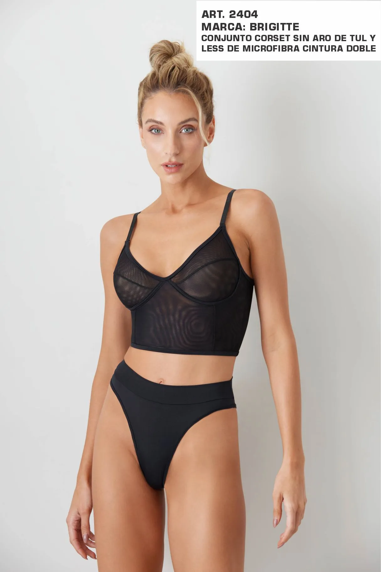 CONJUNTO CORSET SIN ARO DE TUL Y LESS DE MICROFIBRA CON CINTURA DOBLE. TALLES: 85 AL 105. COLORES: NEGRO