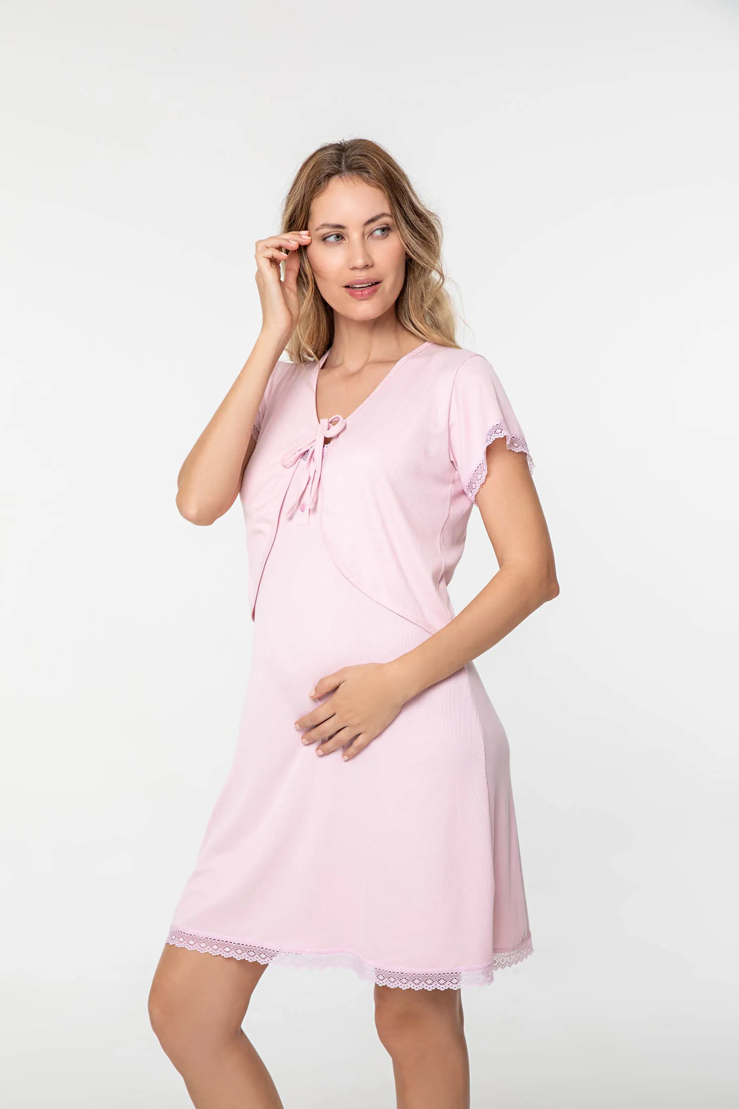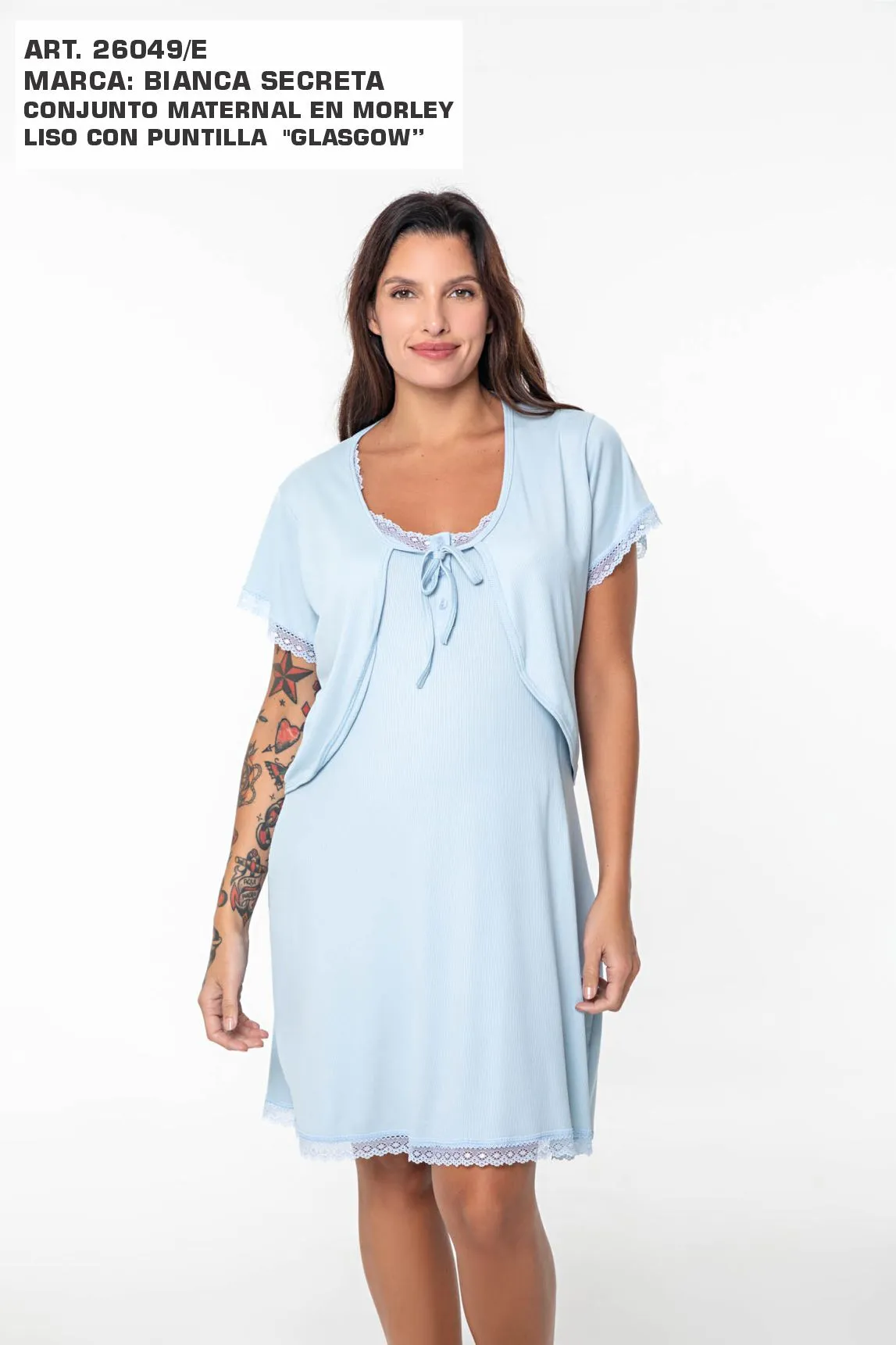 CONJUNTO MATERNAL EN MORLEY LISO CON PUNTILLA "GLASGOW". TALLES: 5(XXL) AL 7(4XL). COLORES: BLANCO - ROSA - CELESTE
