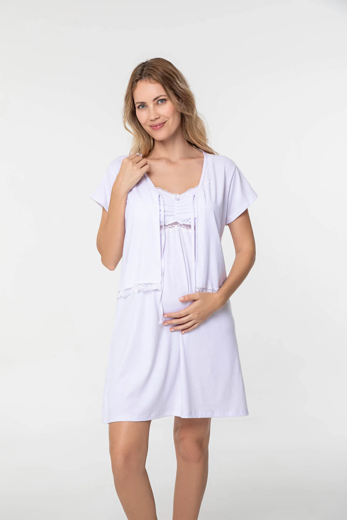 CONJUNTO MATERNAL EN MODAL LISO CON PUNTILLA "TURIN". TALLES: 1(S) AL 4(XL). COLORES: BLANCO - SALMON - GRIS MELANGE