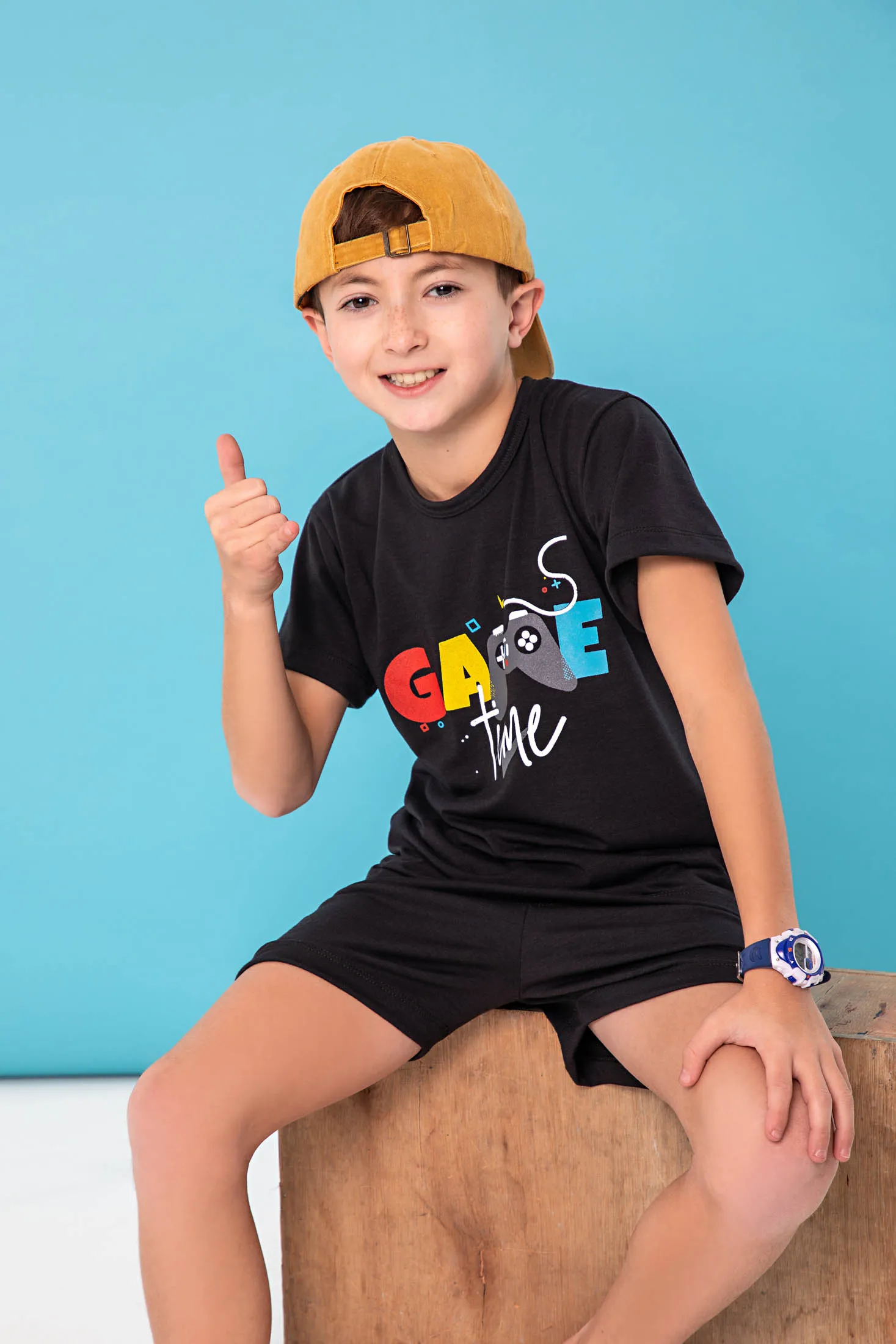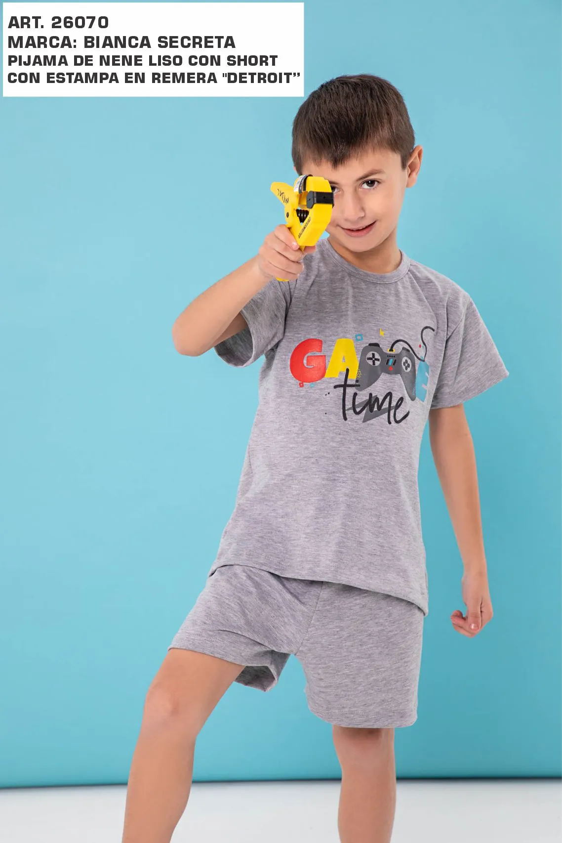 PIJAMA DE NENE LISO CON SHORT CON ESTAMPA EN REMERA "DETROIT". TALLES: 4 AL 8. COLORES: NEGRO - GRIS MELANGE
