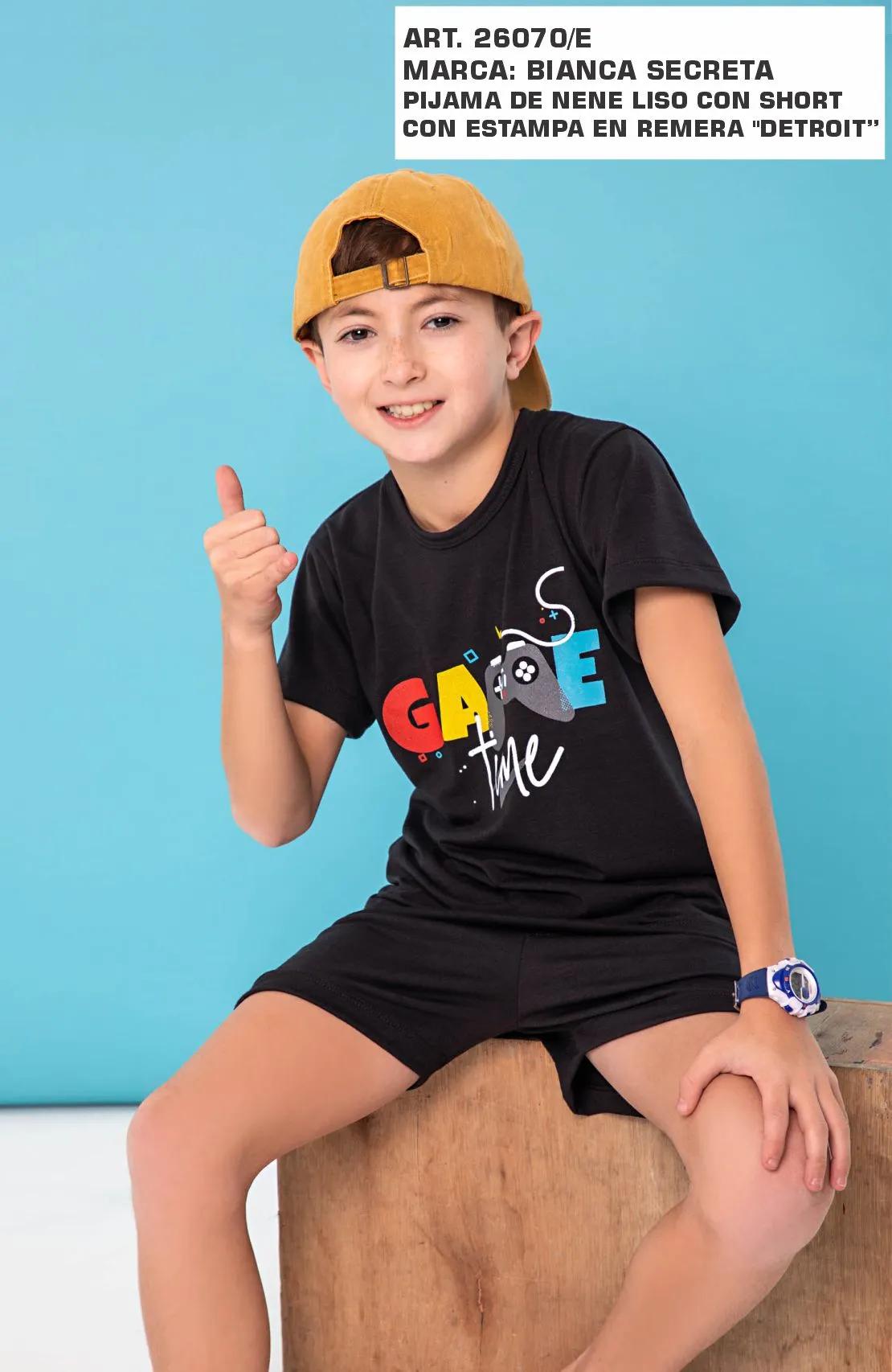 PIJAMA DE NENE LISO CON SHORT CON ESTAMPA EN REMERA "DETROIT". TALLES: 10 AL 14. COLORES: NEGRO - GRIS MELANGE