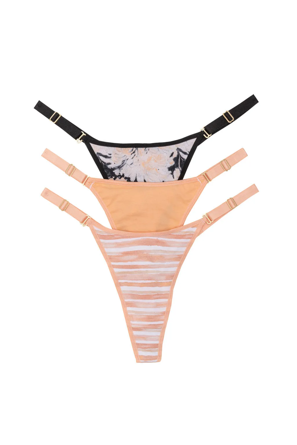 PACK POR TRES UNIDADES DE TANGAS CAVADAS DE ALGODON Y LYCRA ESTAMPADO "DURAZNO". TALLE: UNICO (M). COLORES: SURTIDOS