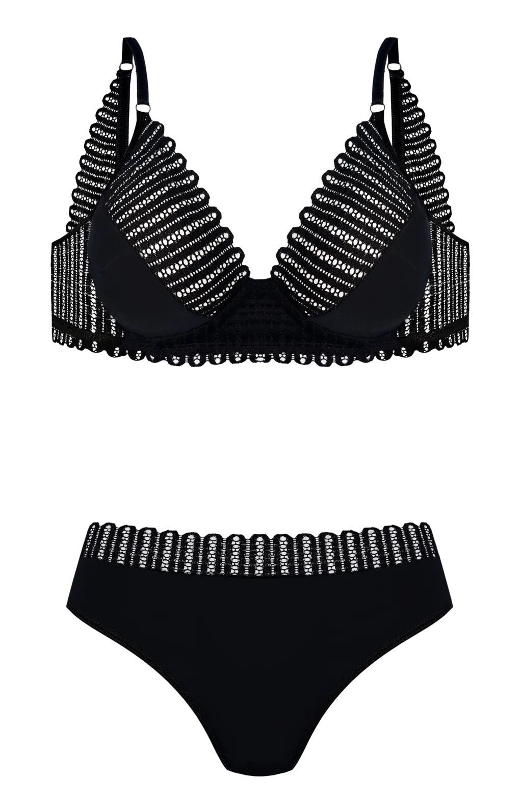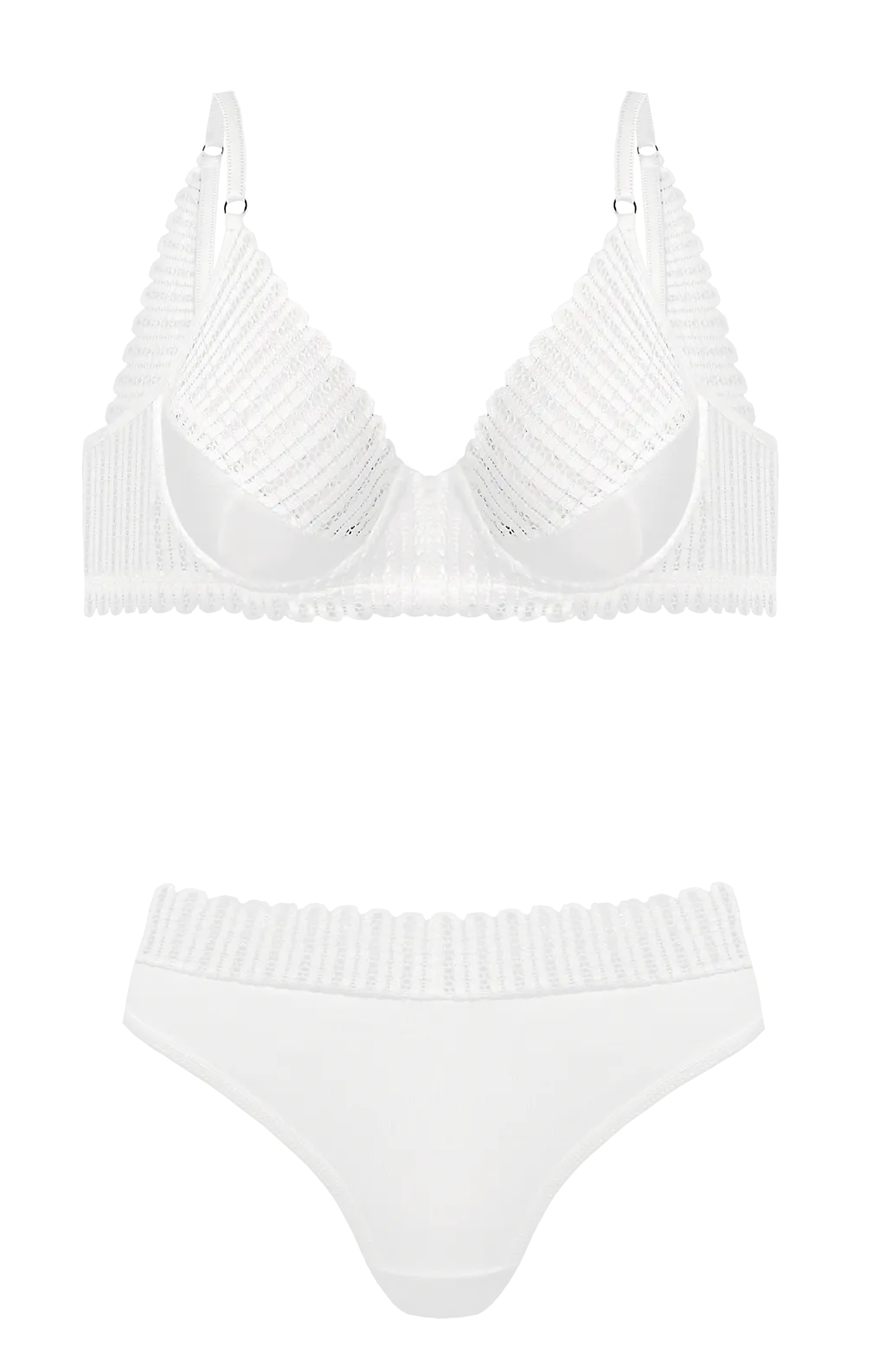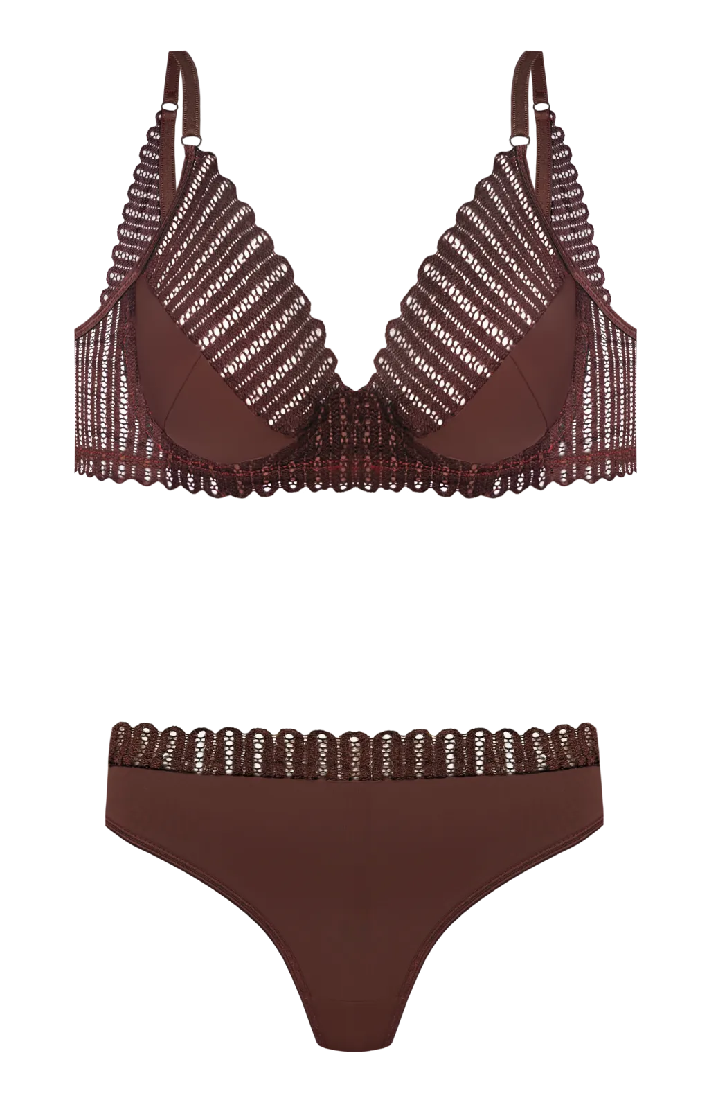 CONJUNTO SIN TAZA CON ARCO DE MICROFIBRA COMBINADA CON PUNTILLA TRAMADO BASTONES Y COLALESS. TALLES: 85 AL 100. COLORES: BLANCO - NEGRO - CHOCOLATE - ROJO