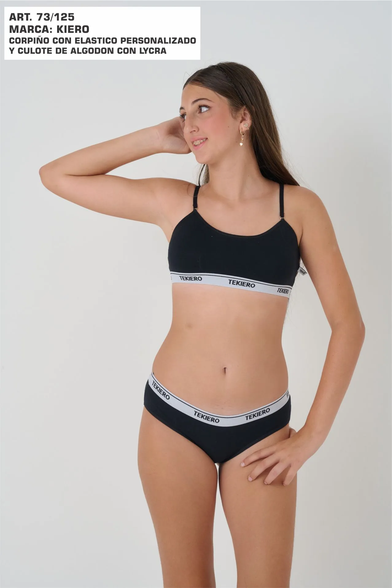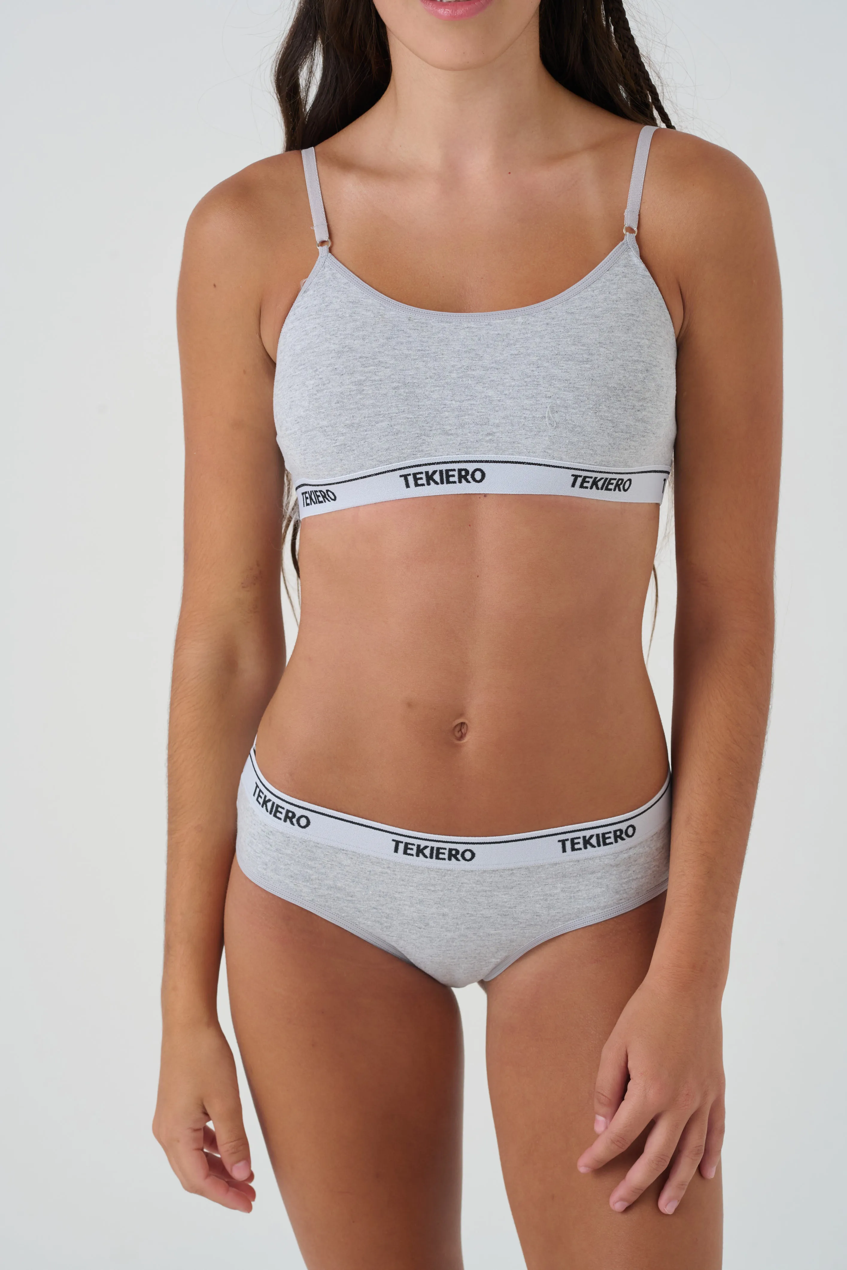 CORPIÑO CON ELASTICO PERSONALIZADO Y CULOTE DE ALGODON CON LYCRA. TALLES: 12(80) AL 18(95). COLORES: GRIS MELANGE - NEGRO - BLANCO