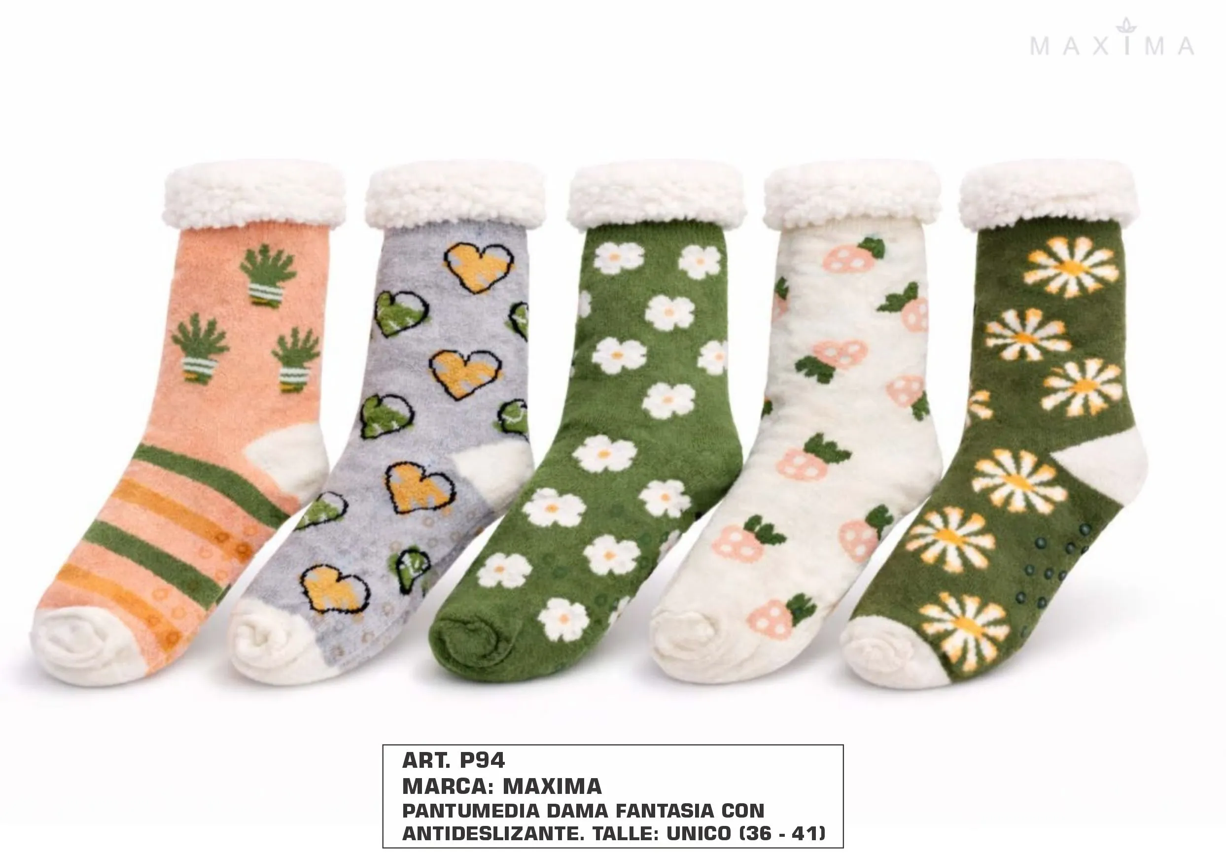 PANTUMEDIA DAMA FANTASIA CON ANTIDESLIZANTE. TALLE: UNICO (36 - 41). COLORES: VERDE MARGARITAS BLANCAS - BLANCO CON FRUTILLAS - GRIS CON CORAZONES - VERDE FLORES ROSAS - ROSA CON CACTUS